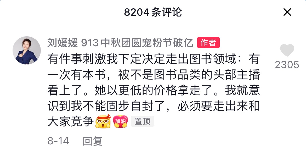 劉媛媛在關於帶貨全品類的視頻裏,講述某些不是圖書品類的頭部主播,以更低價格拿到書的銷售授權,這促使其產生轉型全品類帶貨的想法,併力求拿下更低價的書籍。不難看出,全品類帶貨能夠展現其帶貨水平,她能以此提升對外的議價能力。