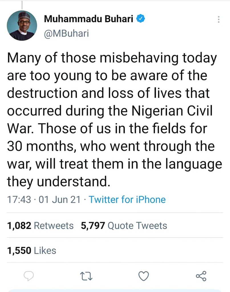 説到這裏,我也來講講自己的觀點。很多小國的歷史,都可以用一句話概括,那就是:哪裏有壓迫,哪裏就會有反抗。比亞法拉內戰後,尼日利亞12任國家領導人裏,沒有一個出身於東部。而歷任執政者,只是想方設法鎮壓東部的反抗,製造出“今日無事”、“歌舞昇平”的假象,卻沒有從根本上解決問題。今年6月,東部反政府武裝襲擊當地政府大樓,總統布哈里發推特,威脅“經歷過殘酷戰爭的人,會用他們聽得懂的‘語言’來對待他們”,結果被推特以“煽動暴力”刪帖了。
