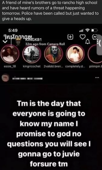 8月18日晚上,內陸地區蘭喬庫卡蒙加高中(Ranch Cucamonga high school)一名高中生在自己的網站上貼出了揚言拿槍去學校威脅的言論引起家長們關注並報警。