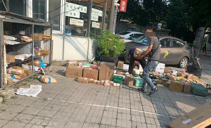 在北京昌平某住宅區,柒財經注意到,很多家快遞包裹被整齊地擺放在一個空場地上,且每個包裹外包袋上被快遞員寫上一串號碼。