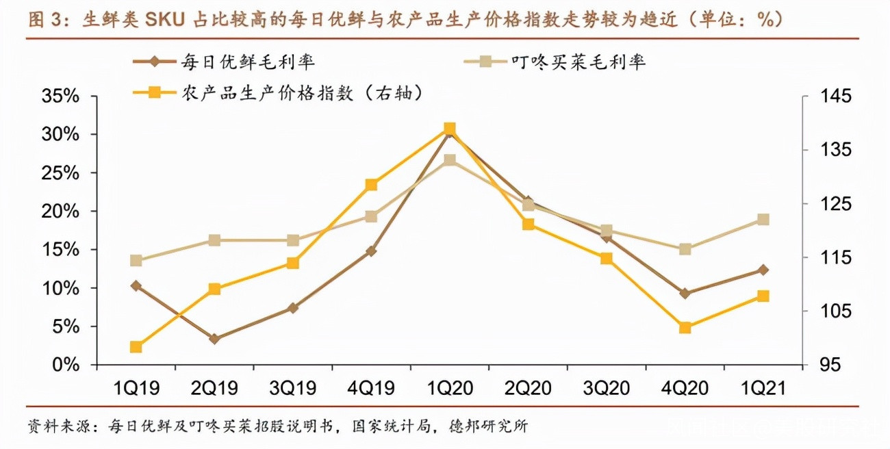 每日優鮮與叮咚買菜的毛利率差異主要體現在生鮮SKU佔比的差異。每日優鮮生鮮產品佔比較高,叮咚買菜SKU中日化用品佔比更高,因此高毛利的日化用品為平台毛利提供更優數據。