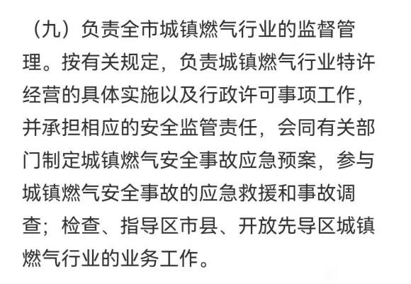 第四,市住房和城鄉建設局的主要職責明確規定:負責全市城鎮燃氣行業的監督管理。負責城鎮燃氣行業特許經營的具體實施以及行政許可事項工作,並承擔相應的安全監管責任。