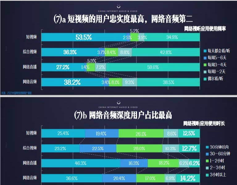 而在使用時長和使用習慣上,音頻深度用户的黏性也超過了綜合視頻。