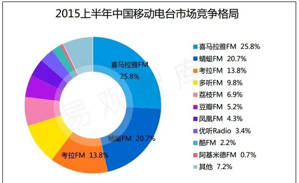 喜馬拉雅也在2015年成長為行業第一。據易觀智庫《中國移動電台市場專題研究報告2015》顯示,喜馬拉雅FM以25.8%的市場份額位居行業第一,領先第二名蜻蜓FM 5.1個百分點。