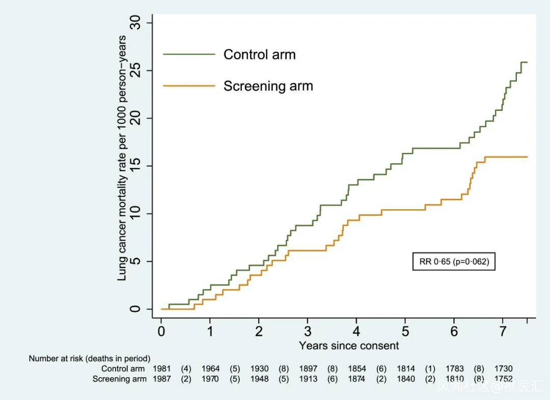 共有1987名篩查組參與者和1981名對照組參與者接受了約7.3年的隨訪。LDCT組診斷出86例癌症,報告了30例肺癌死亡;對照組診斷出75例癌症,報告了46例肺癌死亡。統計結果顯示,LDCT篩查組肺癌死亡風險降低35%,男性和女性獲益相似(肺癌死亡風險降低37% vs 31%),但統計學上不夠顯著。