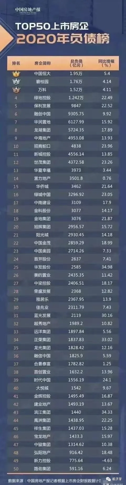 下圖是中國排名靠前的幾十家房地產公司的負債情況,看看吧,哪一家公司現在沒有頂着暴雷壓力,哪一個不望眼欲穿渴盼國家救援?誰還有能力當其他人的接盤俠?