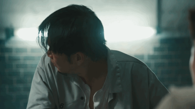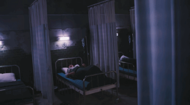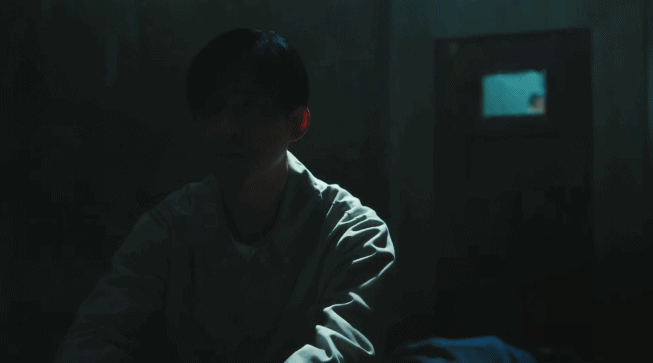 旋轉的鏡頭+暗紫的色調,凸顯出梁炎東在病房中身體的痛苦和被夢魘折磨的心理煎熬。