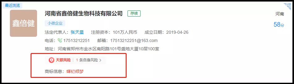 如果你嘗試在天眼查搜索商標信息“蝶初傾夢”,會找到一家叫做河南省鑫倍健生物科技有限公司。天眼查APP顯示,其經營範圍包括生物技術開發、技術諮詢;貨物或技術進出口(國家禁止或涉及行政審批的貨物和技術進出口除外);銷售:保健食品、預包裝食品、散裝食品、第一類醫療器械、電子產品、化妝品、文具、日用百貨。