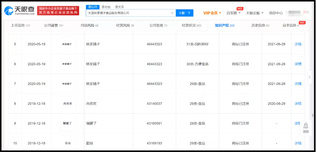 這其中,採購佔比最大的是大連林家鋪子,佔比達到了24.90%。進入這家公司的主頁,可以在知識產權板塊找找看商標信息,就能找到林家鋪子、肉歡歡、甜麗等多個商標。