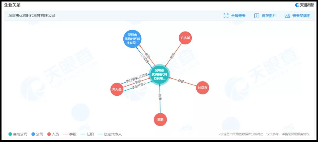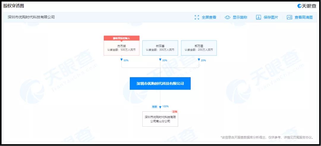 天眼查APP顯示,深圳優購時代成立於2012年9月,註冊資本1000萬人民幣,法定代表人為鄭萬星,而股東信息顯示,該公司由方傑斌、林雙喜、鄭萬星幾個個人股東共同持股。