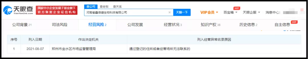 進入這家公司看看,會發現其因“通過登記的住所或者經營場所無法聯繫”,被鄭州市金水區市場監督管理局列入經營異常名錄。