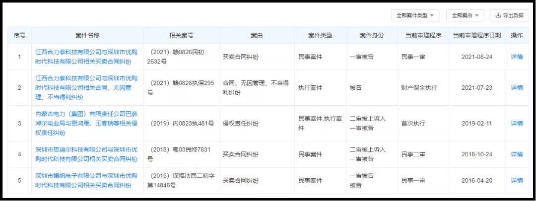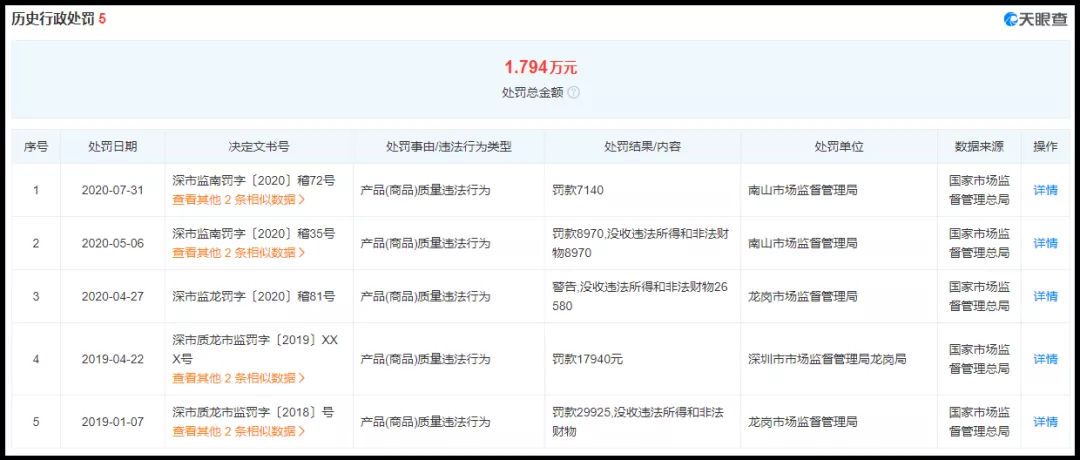 而據天眼查風險信息顯示,優購時代還涉及多條法律案件,案由為侵權責任糾紛、買賣合同糾紛。此外,該公司共有5條行政處罰,處罰事由均為產品(商品)質量違法行為,處罰總金額超6萬,並被沒收違法所得和非法財物。