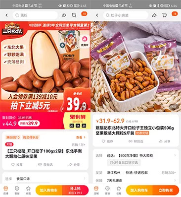 帶着這些商標到淘寶上去看看,你會發現,姚福記松子5斤裝,小顆粒為31.9元、大顆粒為62.9元。而三隻松鼠在聚划算99大促時,100g*2袋的價格都達到了39.9元。