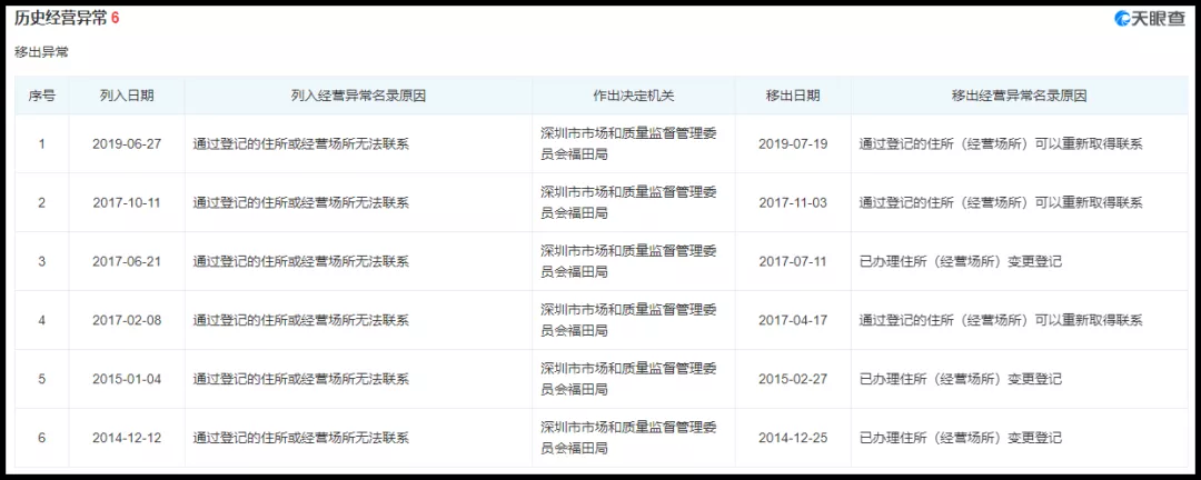 更可怕的是,與上述鑫倍健生物一樣,深圳市市場和質量監管委員會從2014-2019年,連續6次無法通過登記的住所或經營場所聯繫到優購時代,為此多次被列出經營異常名錄。
