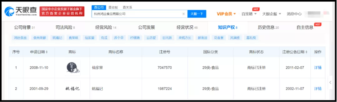 這不是巧合,我們可以在選擇一家小供應商,比如三隻松鼠採購佔比僅佔2.70%的杭州鴻遠食品。同樣點進公司主頁尋找商標信息,能夠看到已註冊仙家裏、姚福記等商標名稱。