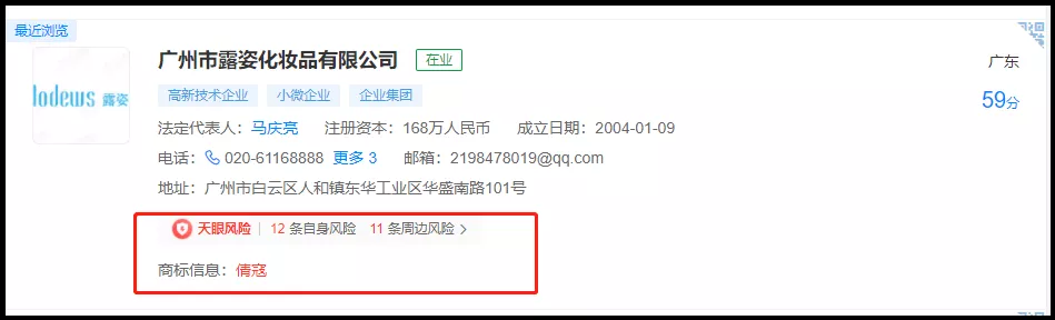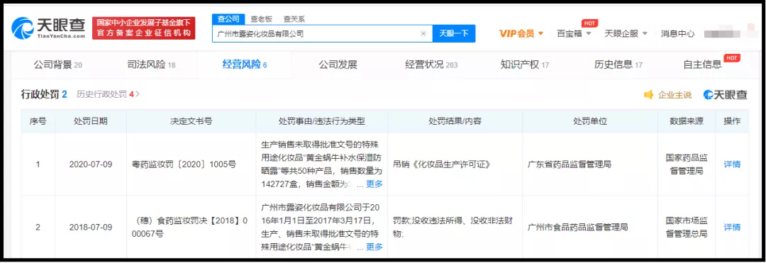 通過商標信息“倩寇”搜索,我們可以在天眼查找到其所屬的公司廣州市露姿化妝品公司。卻發現這家公司早在2018年,就收到了監管局處罰,原因是生產、銷售未取得批准文號的特殊用途化妝品等50種產品。