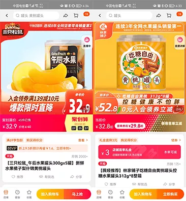帶着這些商標到淘寶上去看看,相同的黃桃罐頭,林家鋪子312g*8罐當前價僅為32.8元;而三隻松鼠300g*5罐,就要32.9元。