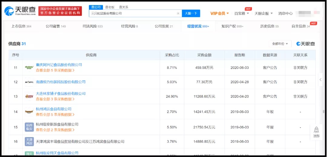 以2021年上半年就賣了價值52.61億元零食的三隻松鼠為例。在天眼查APP中,我們能夠經營狀況中找到三隻松鼠的31個供應商。