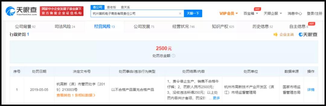 天眼查APP顯示,早在2019年,雪梨直播間就曾以不合格產品冒充合格產品進行銷售,遭到了市場監管局2500元的處罰。