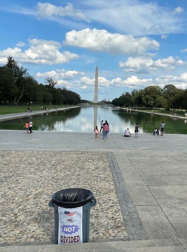 2021年9月11日,美國華盛頓林肯紀念堂前,紀念者放置的一個垃圾桶,上面寫着“不分裂”。(徐劍梅攝)