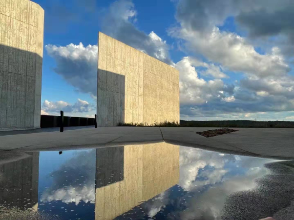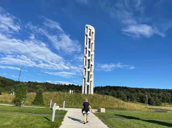 93號航班國家紀念園入口處的地標性建築“聲音塔”高93英尺(約23.8米),正合93號航班之數,內有40個風鈴,它們的鳴響象徵着機上40名機組人員和乘客(不包括劫機的4名恐怖分子)在靜謐中仍然持續的聲音。(徐劍梅攝)