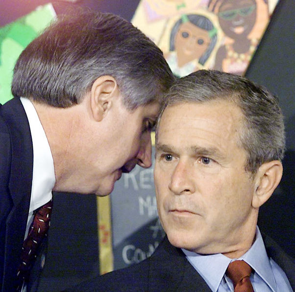 2001年9月11日,時任白宮辦公廳主任安德魯·卡爾德告知小布什第一架飛機撞上世貿大廈的消息。