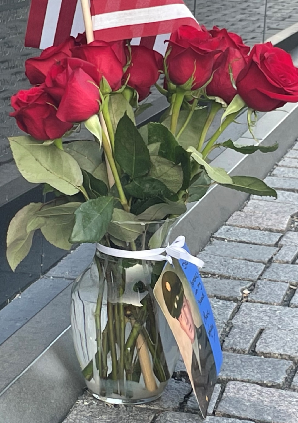 “9·11”20週年來臨之前,美國海軍陸戰隊紀念碑前放置的吉的照片和幾束鮮花。(徐劍梅攝)