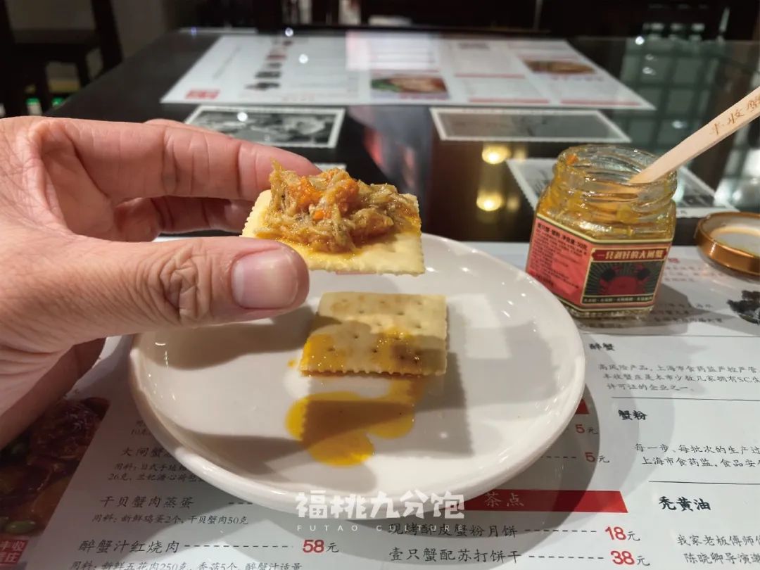 比如説售價38元的“一隻蟹配蘇打餅乾”,就是用一隻蟹的蟹肉、蟹黃、蟹膏做成蟹粉,然後搭配蘇打餅乾的一種零食,吃起來香甜不膩,特別適合當下午茶。