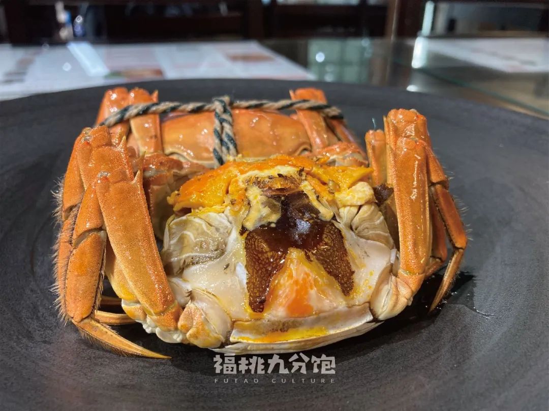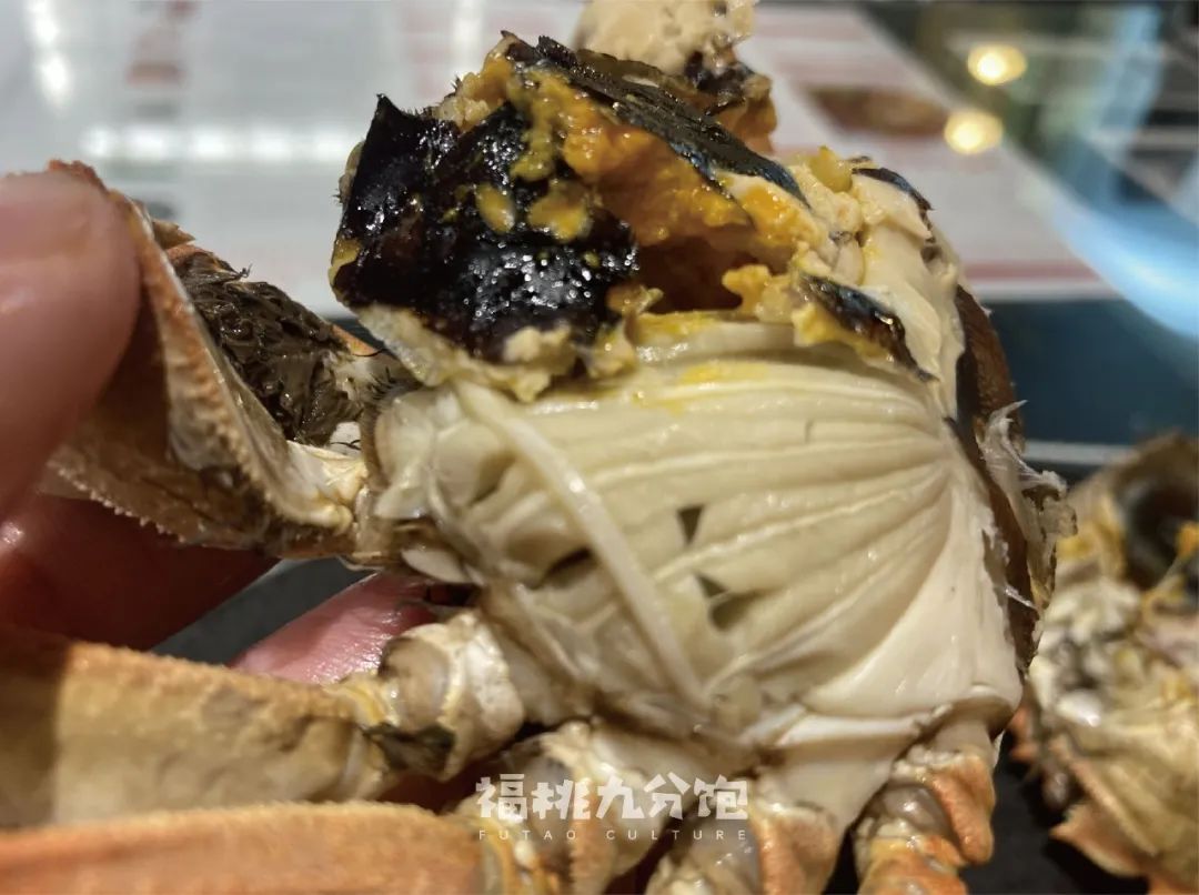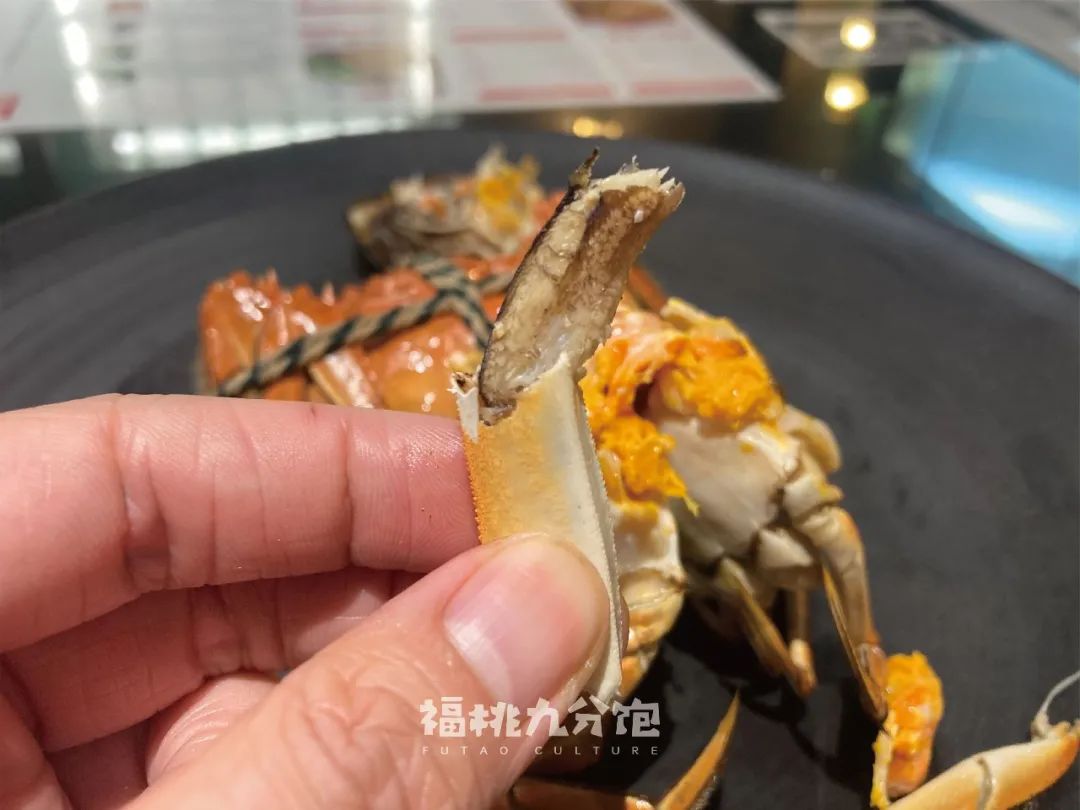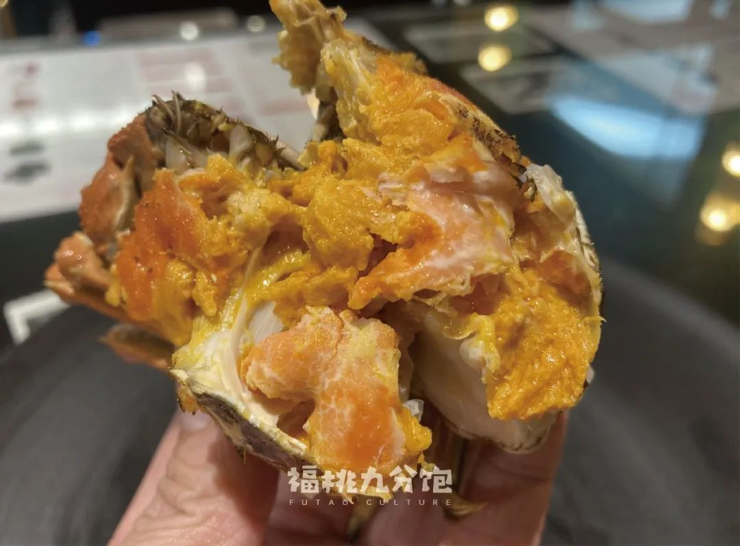 服務員又端起盤子跟我科普:“好的螃蟹,就是四個點:清香、飽滿、鮮甜、流油。就説流油這一點,為什麼有些人不愛吃母蟹,因為他們覺得母蟹太乾了。可是好的母蟹,其實是黃油佔多數的,一點都不幹。”