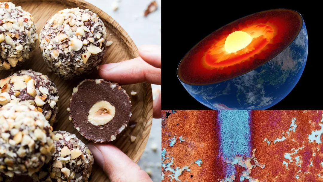 大家應該都吃過這種巧克力球,我們將地球比作一個巧克力的話,裏面這顆果仁就像是一個地核,它基本上都是由鐵來組成的,外面這層巧克力可以比作是地幔,最外面是一層薄薄的地殼。