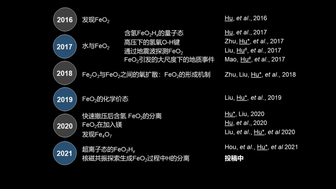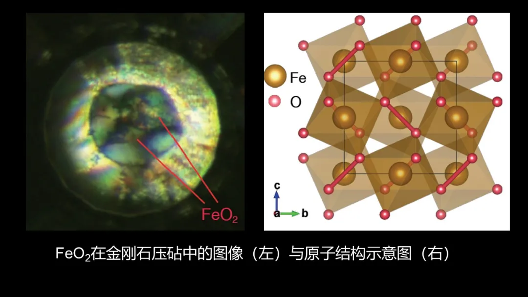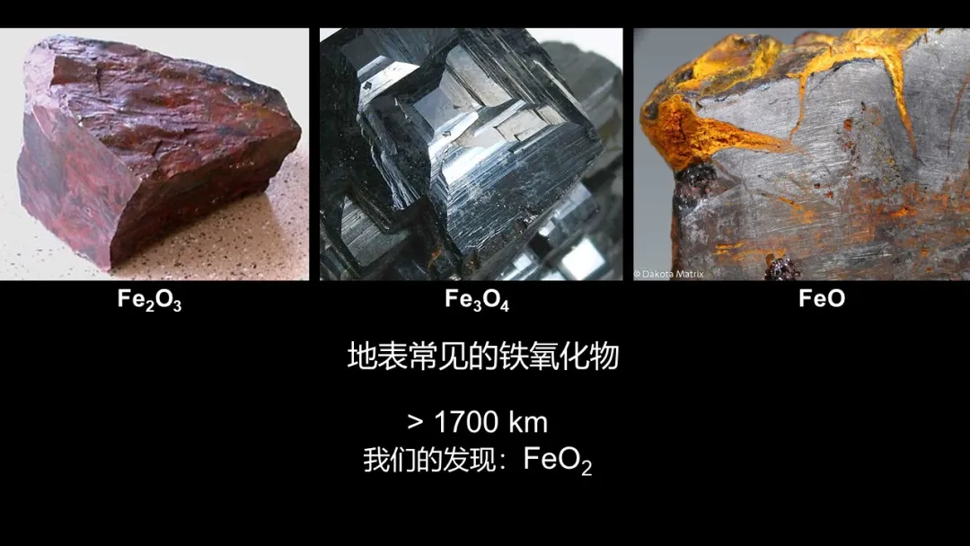 二氧化鐵,它的特點就是氧比較多,我們可以想象是把一些額外的氧氣打到了氧化鐵裏邊,然後它也是一種只在高壓下才能穩定的,如果我們把壓力撤去了,它又會重新變成三氧化二鐵,並且釋放出氧氣。