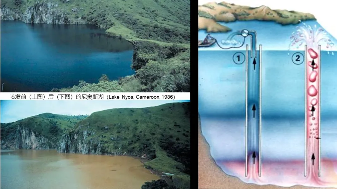 我舉一個例子大家可以參考一下。1986年的時候,喀麥隆有一個叫做尼奧斯湖的地方,發生了一次湖底的噴發,它將大量的二氧化碳氣體噴發出來。因為二氧化碳氣體的比重比空氣重,所以當二氧化碳氣體又降落下來的時候,它就會淹沒到附近的村莊,然後排出周圍的空氣,最終造成幾千人的窒息死亡。
