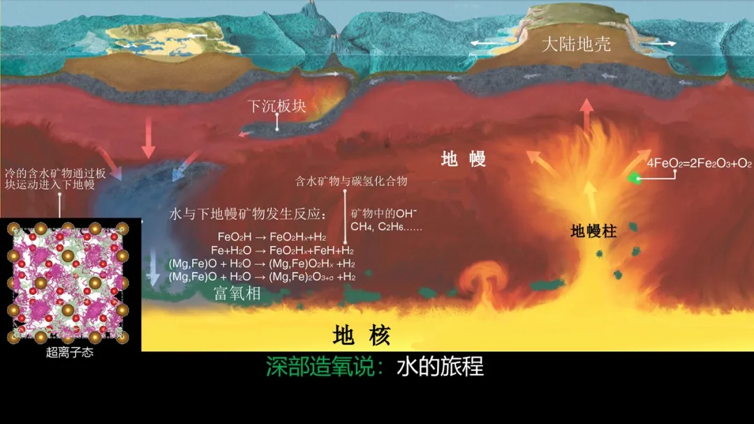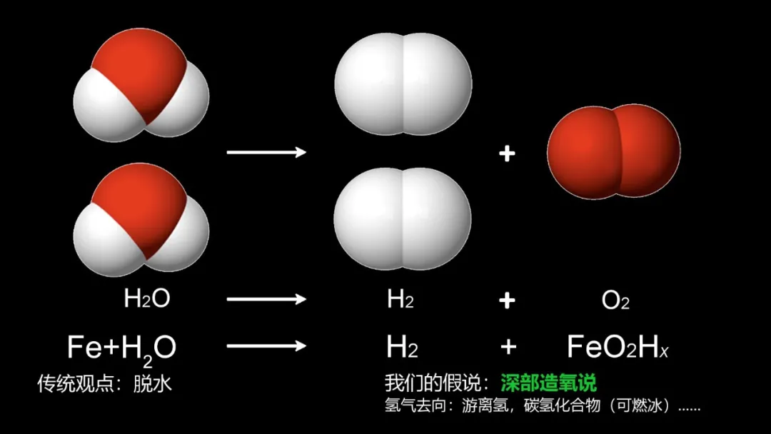 我們假説的名字就叫做“深部造氧説”。這張圖片裏面我們例舉了一些化學反應方程式,傳統的觀點認為地球深部有一個水循環,但是水循環最簡單的單位應該就是水,無論是吸水也好,脱水也好,這個水不會自動分解成氫氣和氧氣。