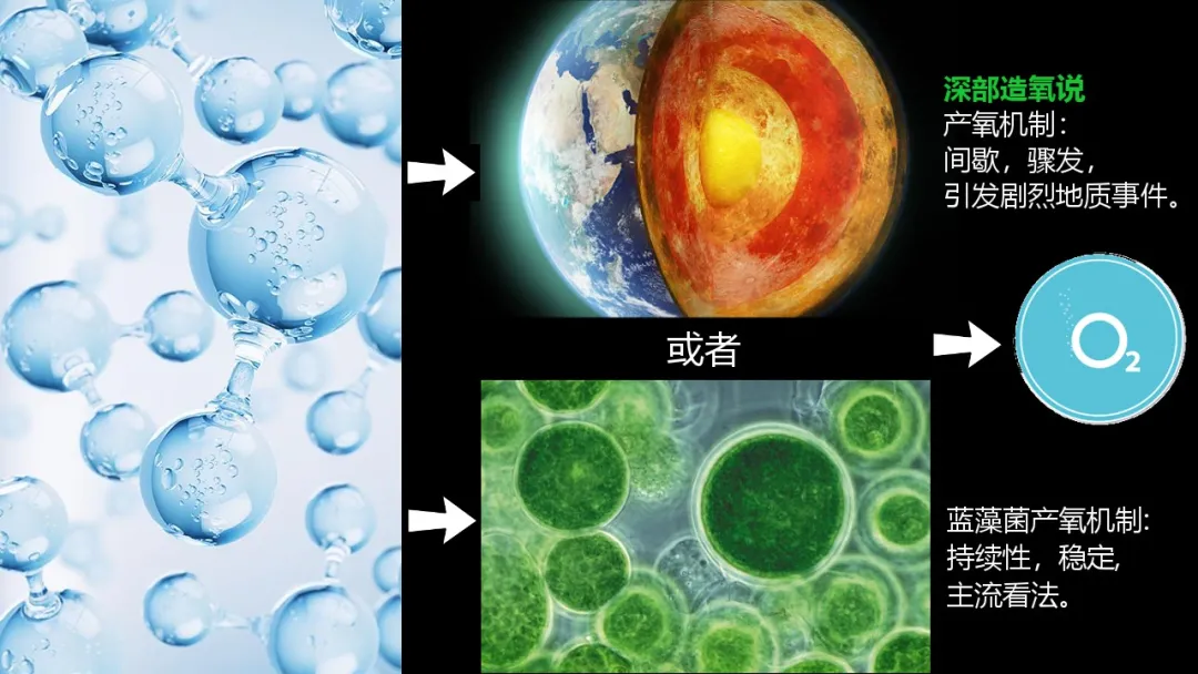 氧氣濃度突然上升,它本身就應該是一個謎團,這邊我就斗膽將我們提出的“深部造氧説”跟“藍藻菌的產氧機制”都列在一張圖上面。