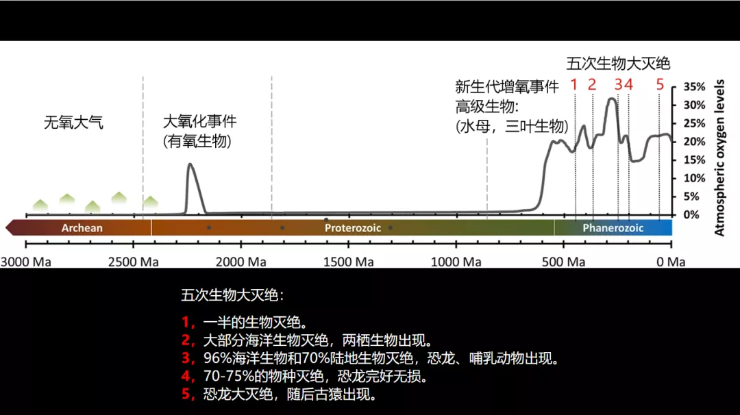 我們就不妨回顧一下歷史吧。第一次的大氧化事件誕生了有氧生物,第二次的新生代的增氧事件發生在6—7億年前,它使得高級生物在地球上產生了,隨後地球發生了差不多現在認為應該是有五次的生物大滅絕。