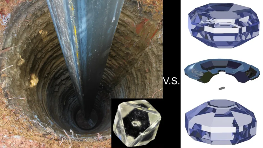 但其實最深的這樣一種井也只有10多千米,尚不及地球的皮毛;但實際上我們還可以利用一些比如説火山過程,從地球內部有一些所謂的包裹體從地球深部出來,這些樣品就封印在鑽石裏邊,稱之為金剛石包裹體,但這樣的樣品,最深也就是幾百千米的水平,差不多最深是到了下地幔的上部,還是沒有辦法覆蓋整個地幔。