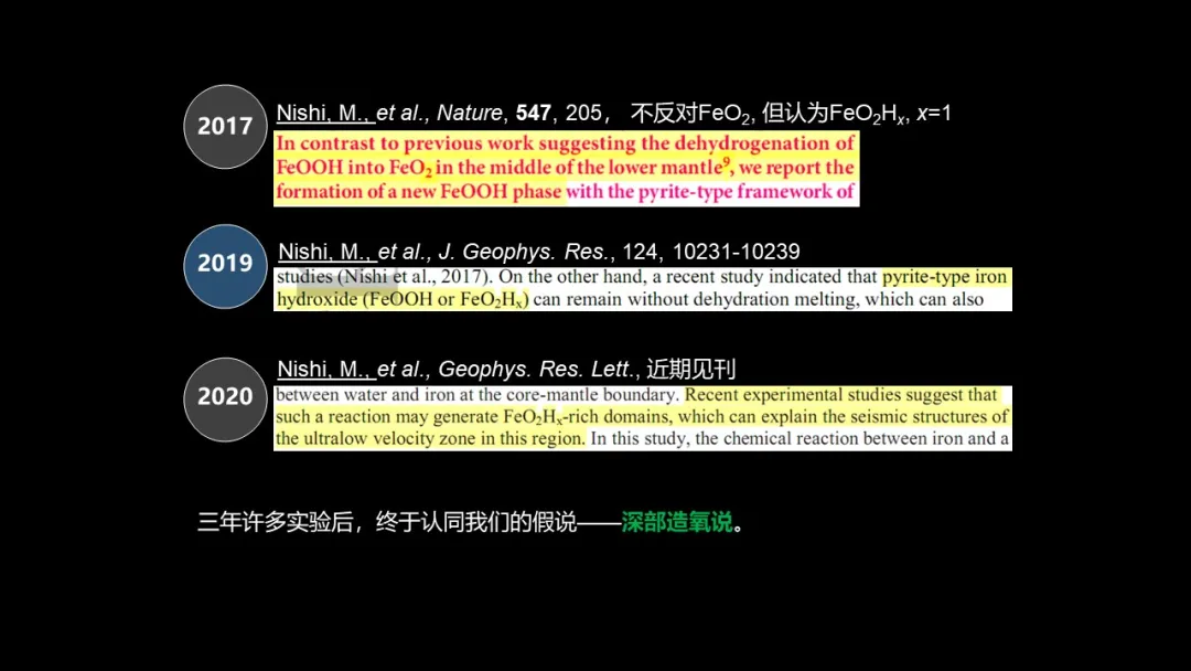 到現在我們確確實實地感受到西真之教授在他的文章裏面的態度已經逐漸軟化,甚至最近的文章已經跟我們的觀點,幾乎是比較相近甚至一致了,這也是我們提出“深部造氧説”之後感到比較欣慰的一點。
