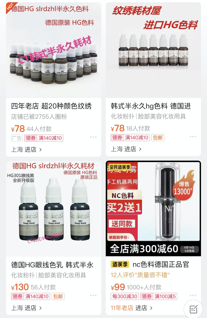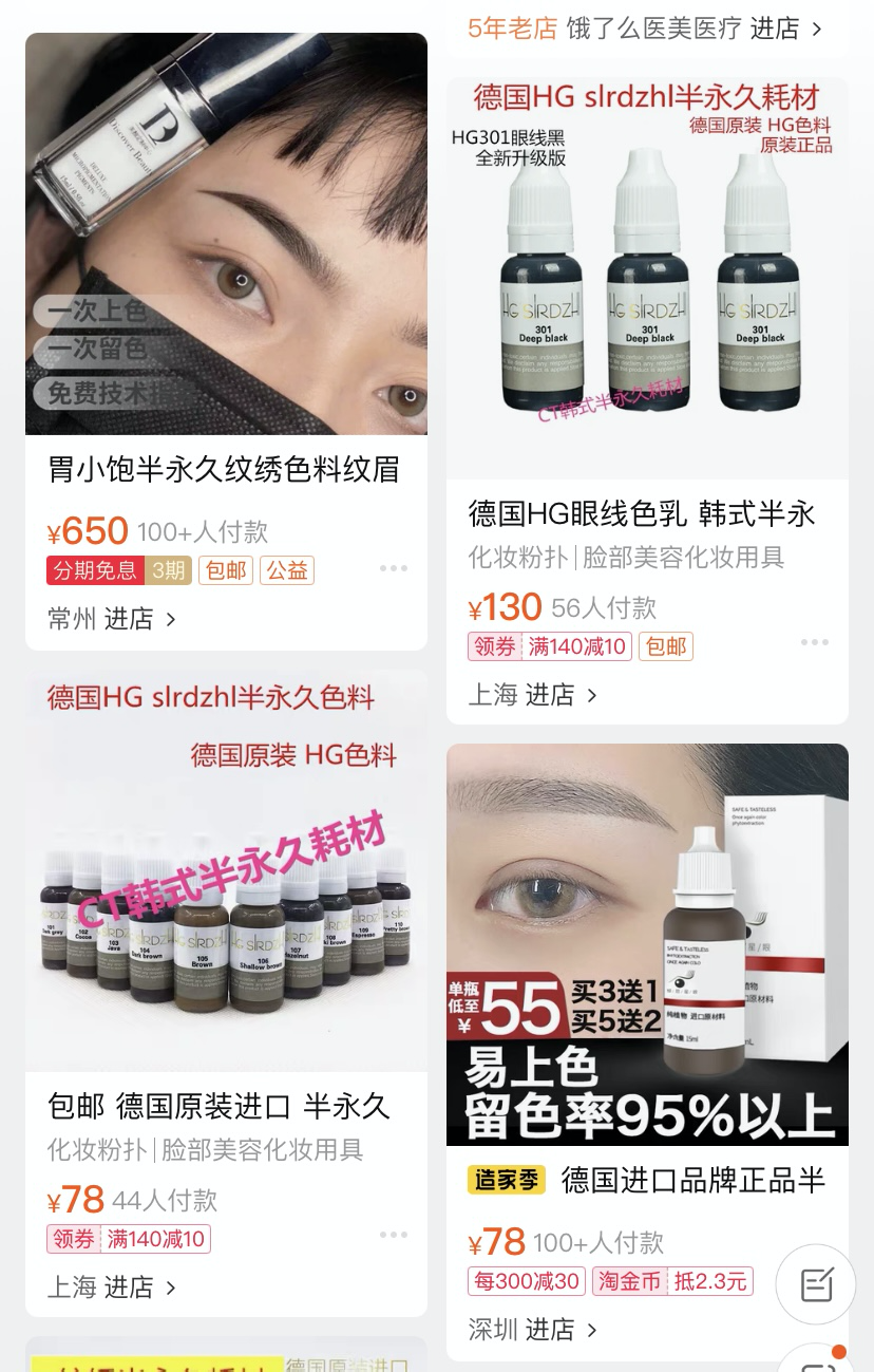 細細觀察一下,半永久的色料有的吧是妝字號的,有的吧是械字號的,還有的吧竟然算是化妝工具。 可是妝字號和化妝工具級別的色料只能作用與人體表面,並不能夠扎進皮膚裏啊!