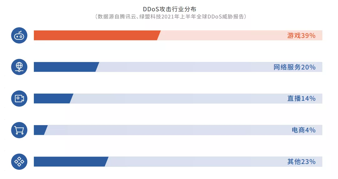 在林林總總的網絡攻擊中,遊戲產業是裏面的重災區。根據相關報告指出,遊戲行業遭受DDoS攻擊佔比高達39%,常年佔據榜首。