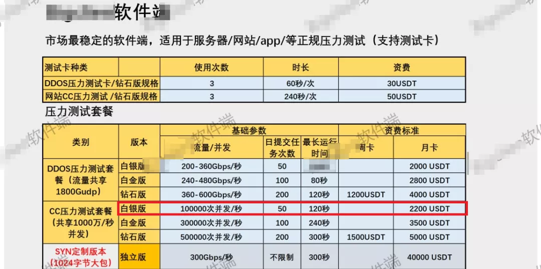 這是黑哥我在TG上找到的一張壓力測試軟件的價格表(説白了就是網絡攻擊的一個軟件)發動100000次併發的CC攻擊,包月服務僅需2200刀。