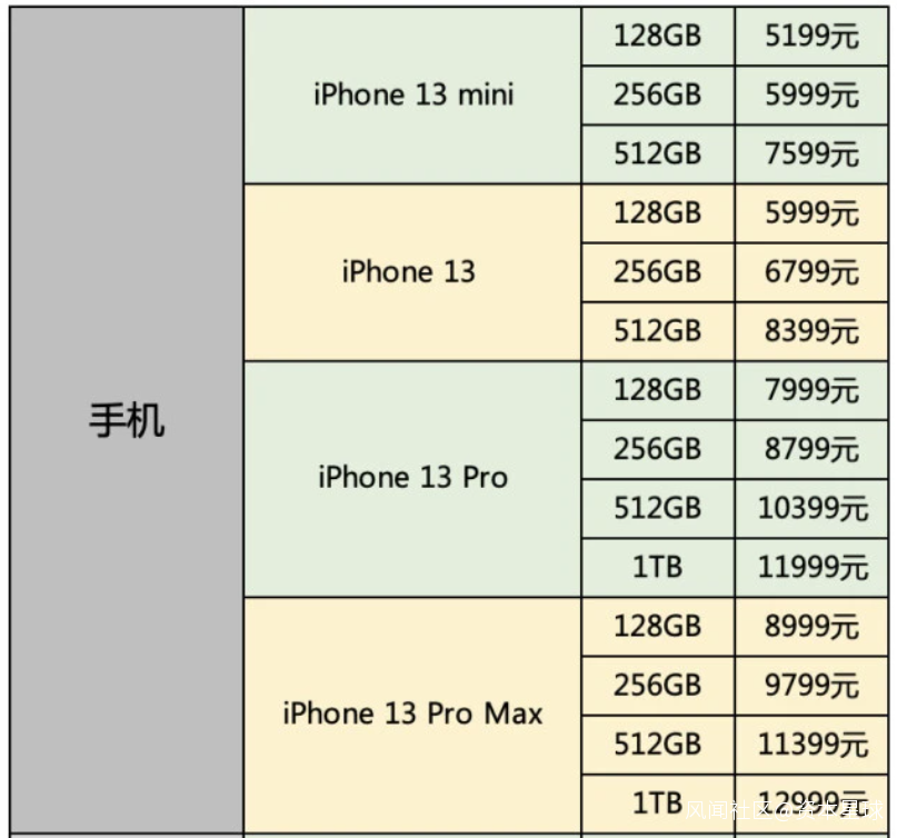 另外,iPhone 13和iPhone 13 mini的起步存儲升級到了128GB,有128GB、256GB和512GB三個存儲版本,配色有粉色、藍色、午夜色、星光色以及紅色五種可選;iPhone 13 Pro和iPhone 13 Pro Max有128GB、256GB、512GB以及1TB四個存儲版本,有遠峯藍色、金色、銀色以及石墨色四種配色可選。