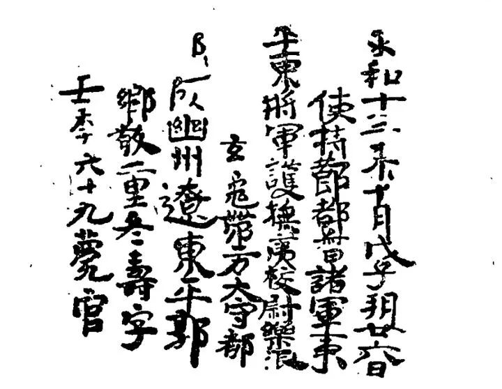 永和十三年十月戊子朔廿六日,使持節都督諸軍事,平東將軍,護撫夷校尉,樂浪、玄菟、帶方太守,都幽州遼東平郭鄉敬上裏冬壽字,安年六十九,薨官。