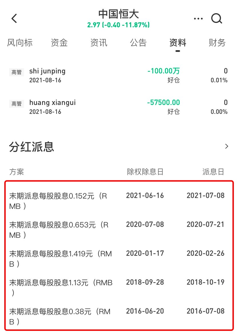 從2018年開始,恒大基本上每年都派息分紅,2020年甚至分了兩次,即使在恒大財富宣佈沒法兑付的消息之前的6月份,還分了一次,都是白花花的銀子。