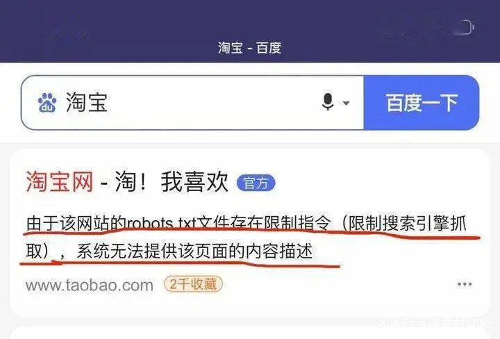 淘寶建立伊始,是可以通過百度搜索具體商品的。但當時淘寶的盈利模式建立在商户購買淘寶直通車上,也就是淘寶的站內搜索。於是淘寶決定禁止被百度搜索機器人抓取就在情理之中了。