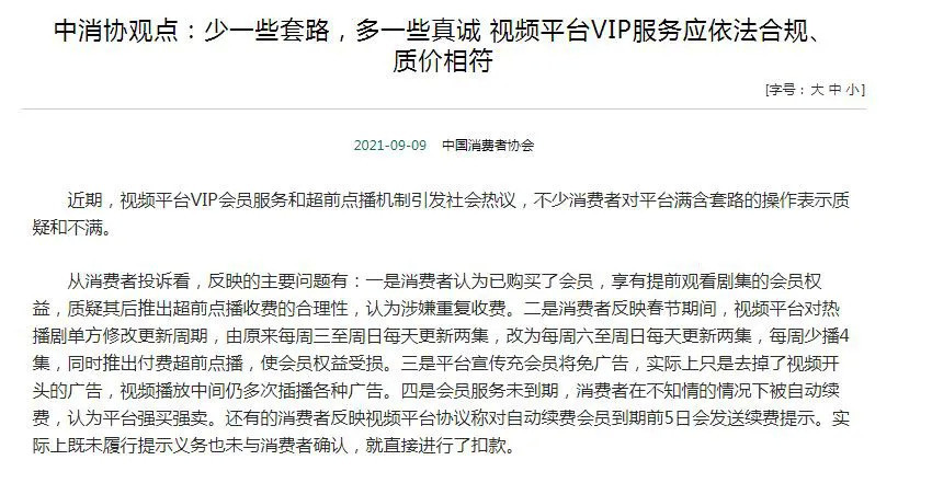 隨後,針對“超前點播”,中消協更是直接髮長文表達了質疑,再度闡釋“超前點播”相關功能設置的不合理。同時指出用户交了會員費,但並沒有真正實現“跳過廣告”的效果。此外,消費者在不知情的情況下“被自動續費”,平台強買強賣。