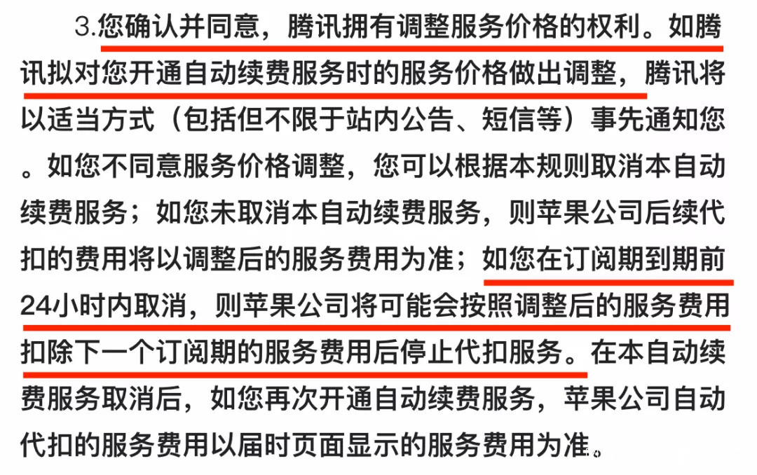 經對比,這和騰訊視頻《自動續費服務規則》中的一條規定基本吻合,意即用户如不滿騰訊調整的新價格,可以手動取消,但騰訊把“完成取消動作”的最後期限圈定在訂閲期到期前24小時內,這時再取消,就要按新價格多付一個週期的費用。
