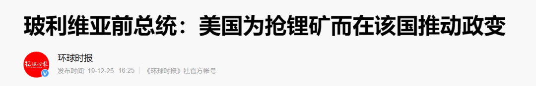 莫拉萊斯還透露了本次政變大量內幕——過去美國多次向他施壓,索取鋰礦開採權,但他拒絕了,在後來的公開招標中,開採權授予了中國和俄羅斯企業,這一點讓白宮大為惱火。