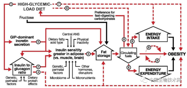 讓我們言歸正傳。上個世紀以來,科學家們對肥胖生物學基礎的理解有了長足的發展。許多研究表明,體重是由涉及多個器官、激素和代謝途徑的複雜和相互關聯的系統控制的。作用於這些系統的常見遺傳變異可能解釋了20%以上的超重和肥胖流行病學。與此同時,還提出了兩種解決肥胖症環境原因的模型。其中,能量平衡模型(EBM)占主導地位的。在該模型中,通過增加能量密集的現代加工食品的攝入量破壞了能量平衡,導致脂肪堆積。在碳水化合物-胰島素模型(CIM)中,飲食的一個關鍵影響是代謝。快速消化的碳水化合物,通過胰島素和其他激素的作用,導致脂肪堆積增加,從而破壞能量平衡。