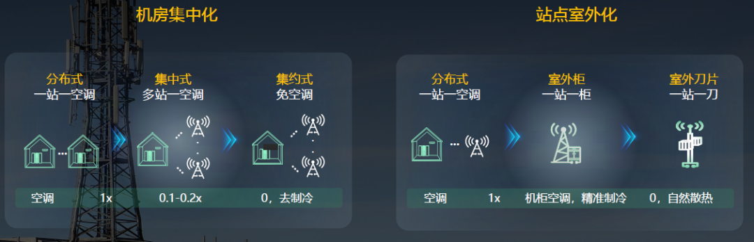 在中日韓等光纖發達的國家,可以採用機房集中化部署,從一站一空調到多站一空調,而在光纖欠發達的國家或農村地區,可以實現站點室外化,使用液冷等高效散熱技術,配合刀片電池免空調,最終實現站點能耗整體降低30%。同時將太陽能引入無線站點,並與業務聯動,在高日照地區可以減少50%的市電消耗。