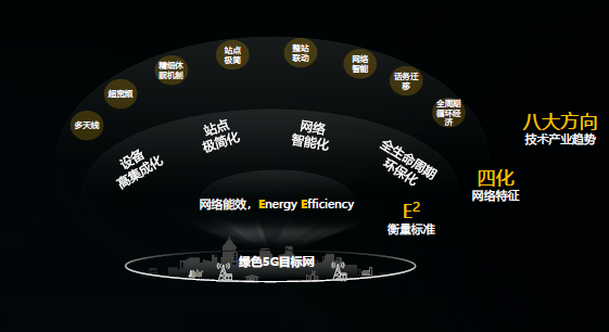 8月30日,華為發佈了《綠色5G白皮書》,這是業界首次發佈綠色5G網絡的能效評估體系——E2(Energy Efficiency),同時也定義了綠色5G網絡的技術趨勢——四化八大方向。所謂四化,即設備高集成化、站點極簡化、網絡智能化、全週期環保化。